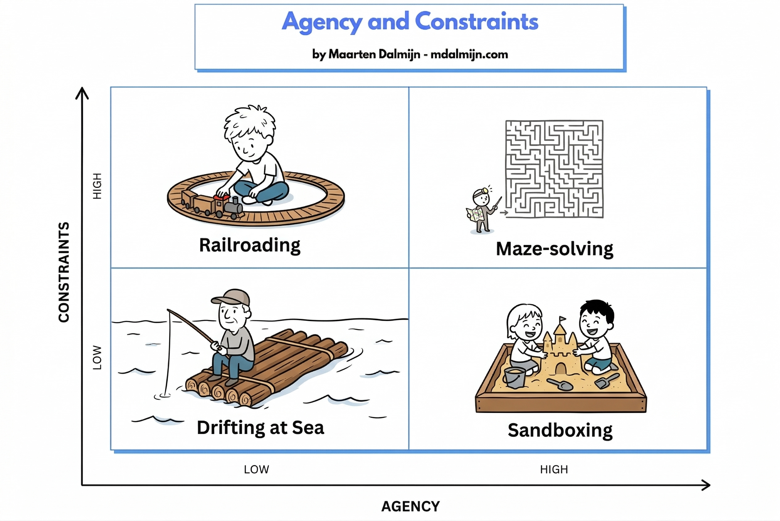 The most common situation at companies is one of low agency and high constraints: railroading.