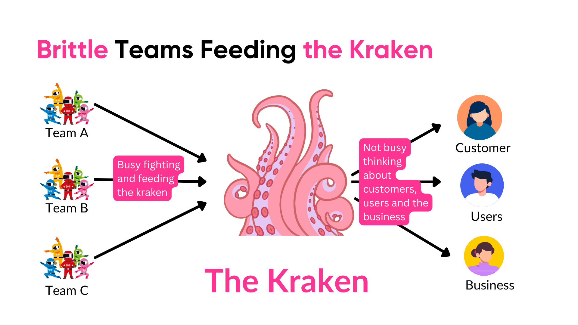 When your organization has a large kraken, you have brittle teams that are disconnected from the work and the results you want, because they are mostly dealing with internal bureaucracy: the tentacles of the kraken.