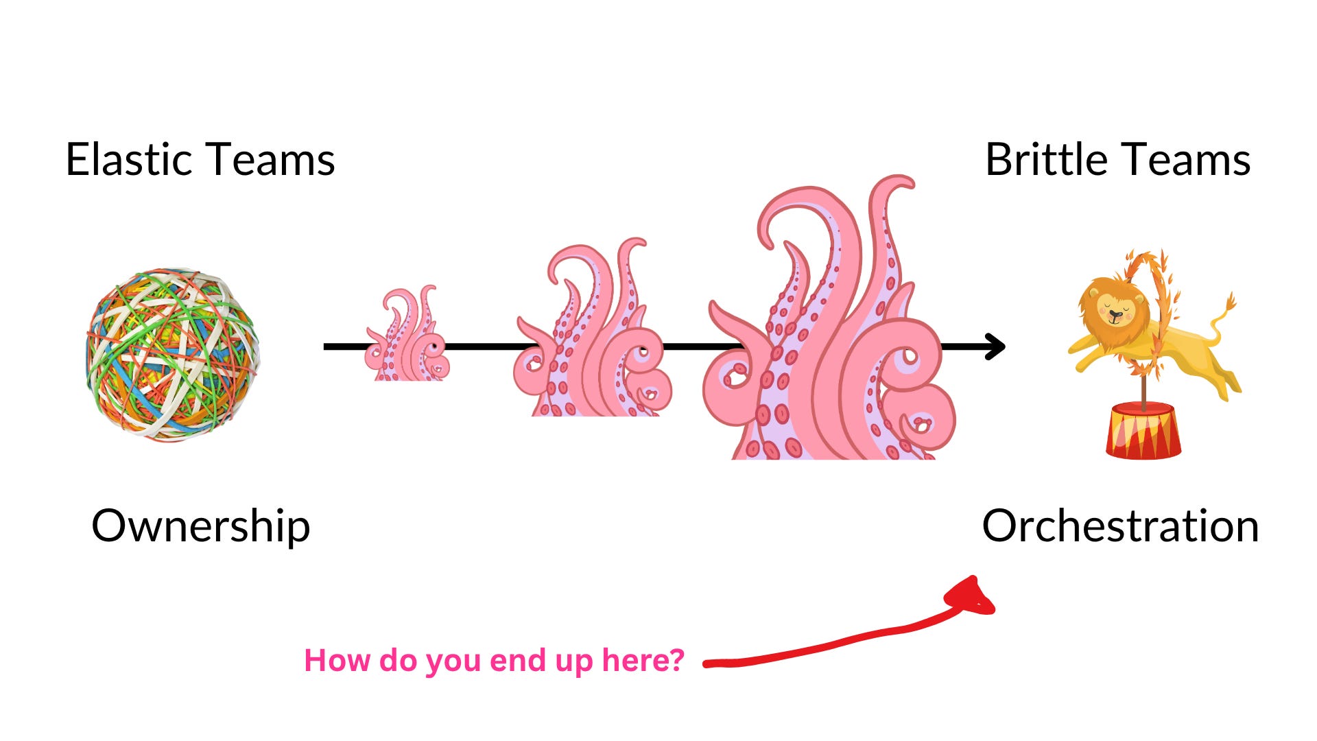 As the kraken grows, there is a gradual shift from Ownership to Orchestration. The teams use up all their elasticity to resolve internal organizational obstacles. Instead of being elastic, they become brittle: they are mostly busy dealing with the inner workings of the company: feeding, fighting and dealing with the Kraken.