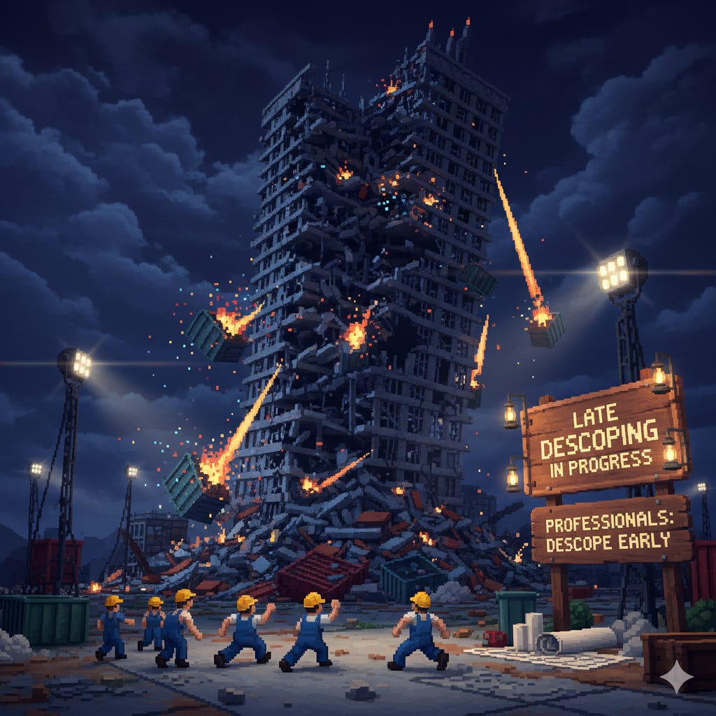 It’s happened to me many times over in my career and it’s a sign of pure incompetence. Late descoping is a red flag, because those must-haves were never must-haves to begin with.