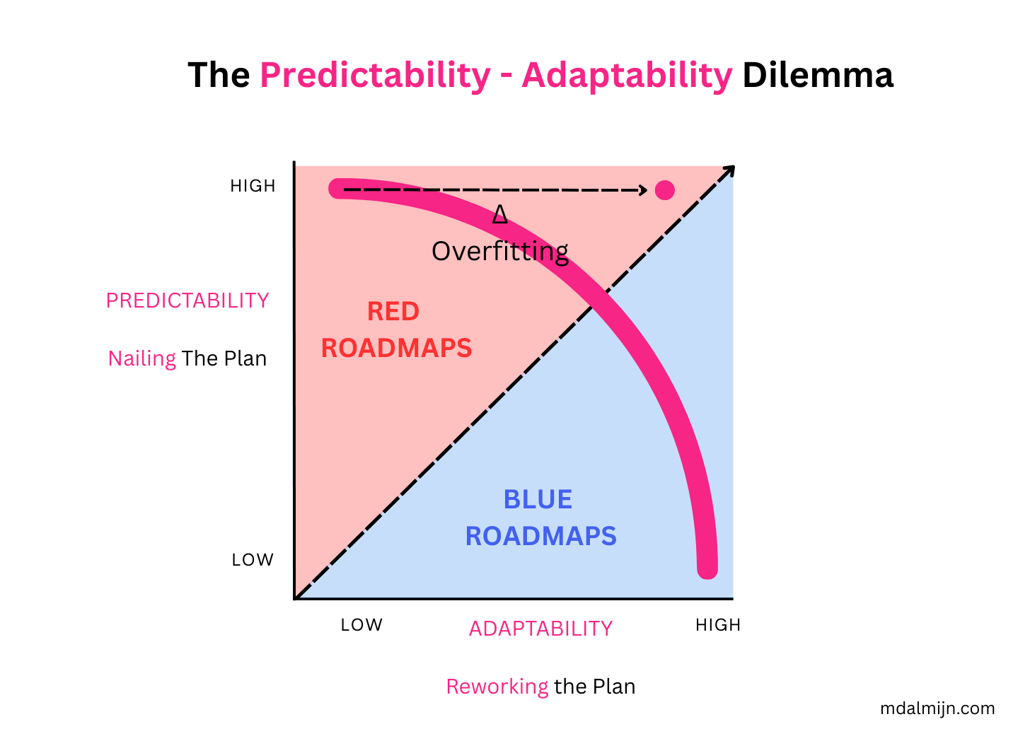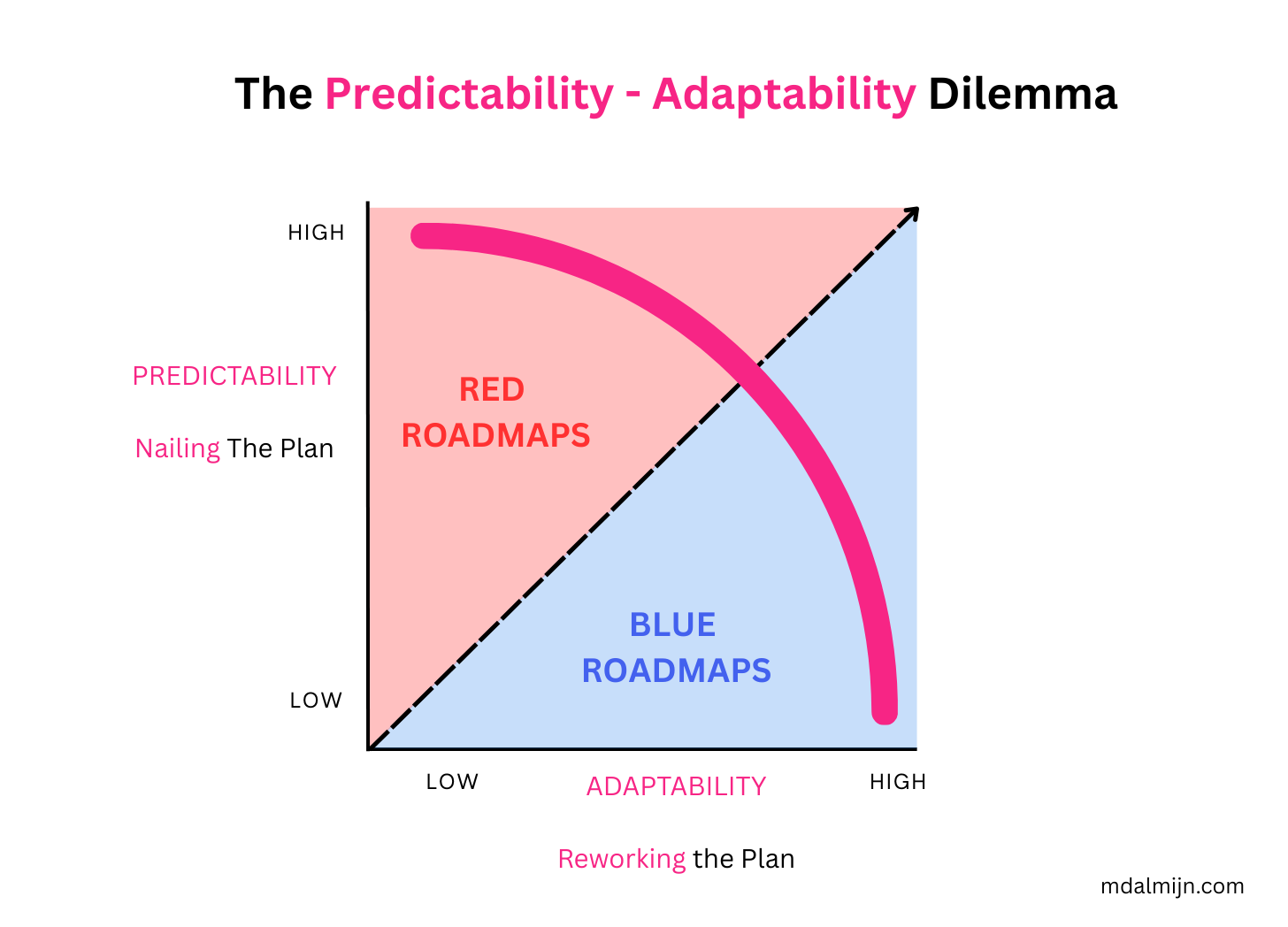 Red Roadmaps are optimized for predictability. Blue roadmaps are optimized for adaptability. I want to stress, both Red and Blue Roadmaps require extensive planning. The key difference is the type of planning and when the planning takes place.