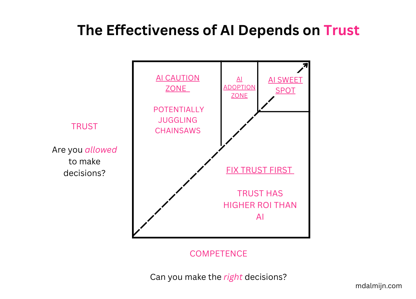 AI Caution Zone. When your employees have low to mid Agency, and they receive an appropriate level of Trust because they’re not Trustcapped, it makes sense to adopt AI, but you should proceed with caution. Make sure they work together with more senior people and ride the Slipstream of Trust, as they’re potentially juggling chainsaws and AI does not have the judgement yet to prevent this from happening.