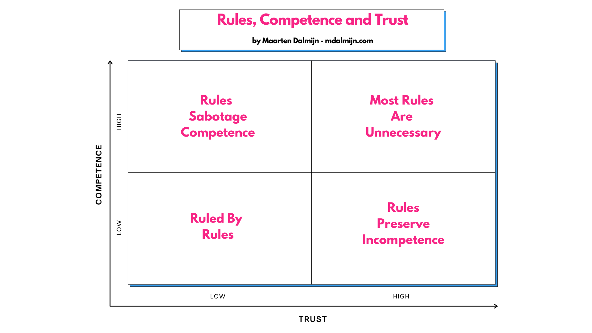 The more rules an organization has, the more busy its people will be with navigating the history of every mistake ever made. They will waste time complying with the internal considerations of an organization as imposed by the rules. This is a daily, sad affair in organizations with low trust and low competence (bottom left in the matrix above).