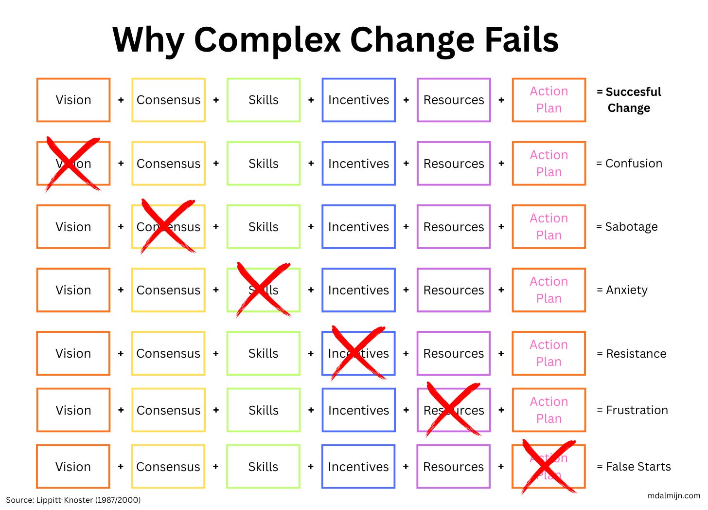 In the Lippitt-Knoster model, if you donāt have Vision, Consensus, Skills, Incentives, Resources, and an Action Plan, then your complex change will fail.